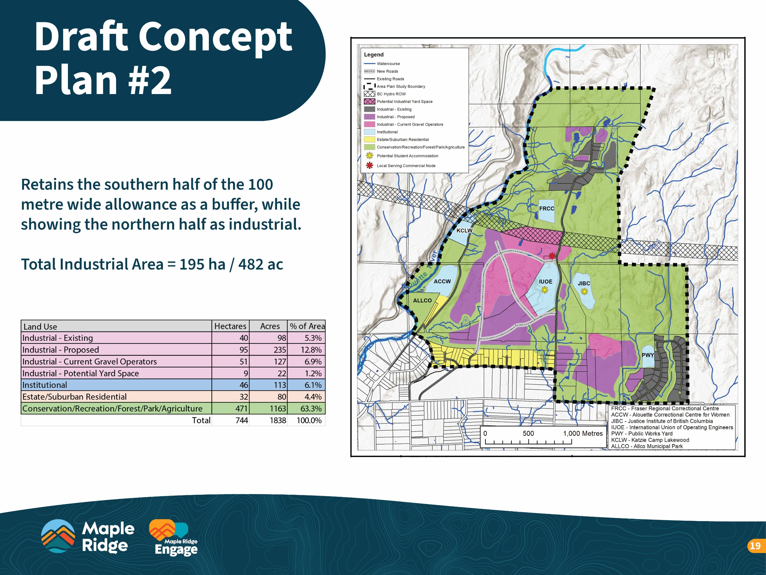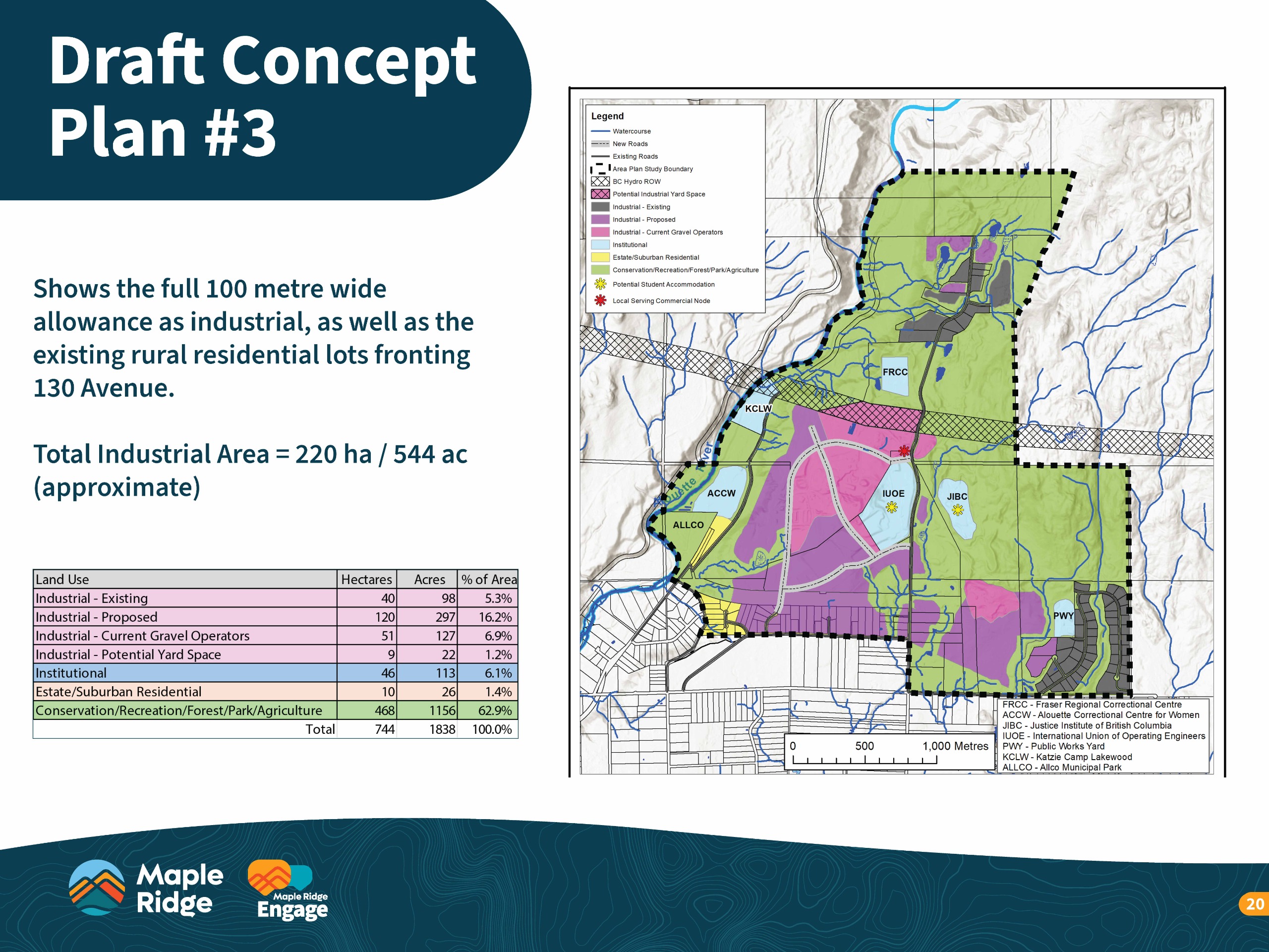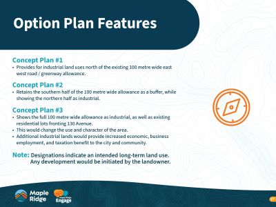- Concept Plan 3 Shows the full 100-metre allowance as industrial and redesignates existing rural residential lots along 130 Avenue. This option delivers the greatest economic and employment benefits by expanding industrial lands but also represents the biggest land use change.