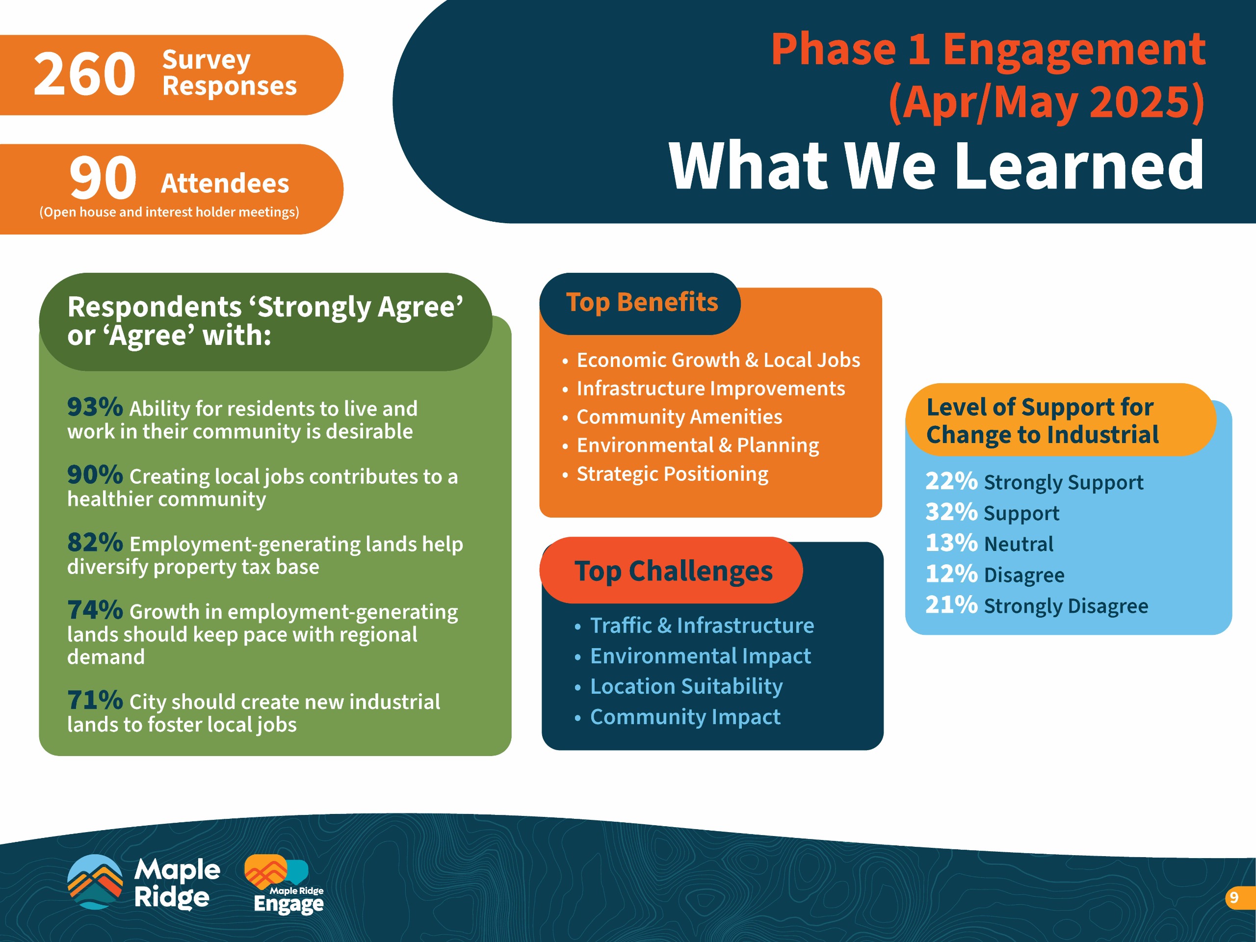 Participants showed strong support for job creation and economic benefits, with some sharing concerns about traffic, infrastructure needs, and preserving community and natural assets. A graphic summary is available below and the summary report can be found here or in the Document Library section on this page.