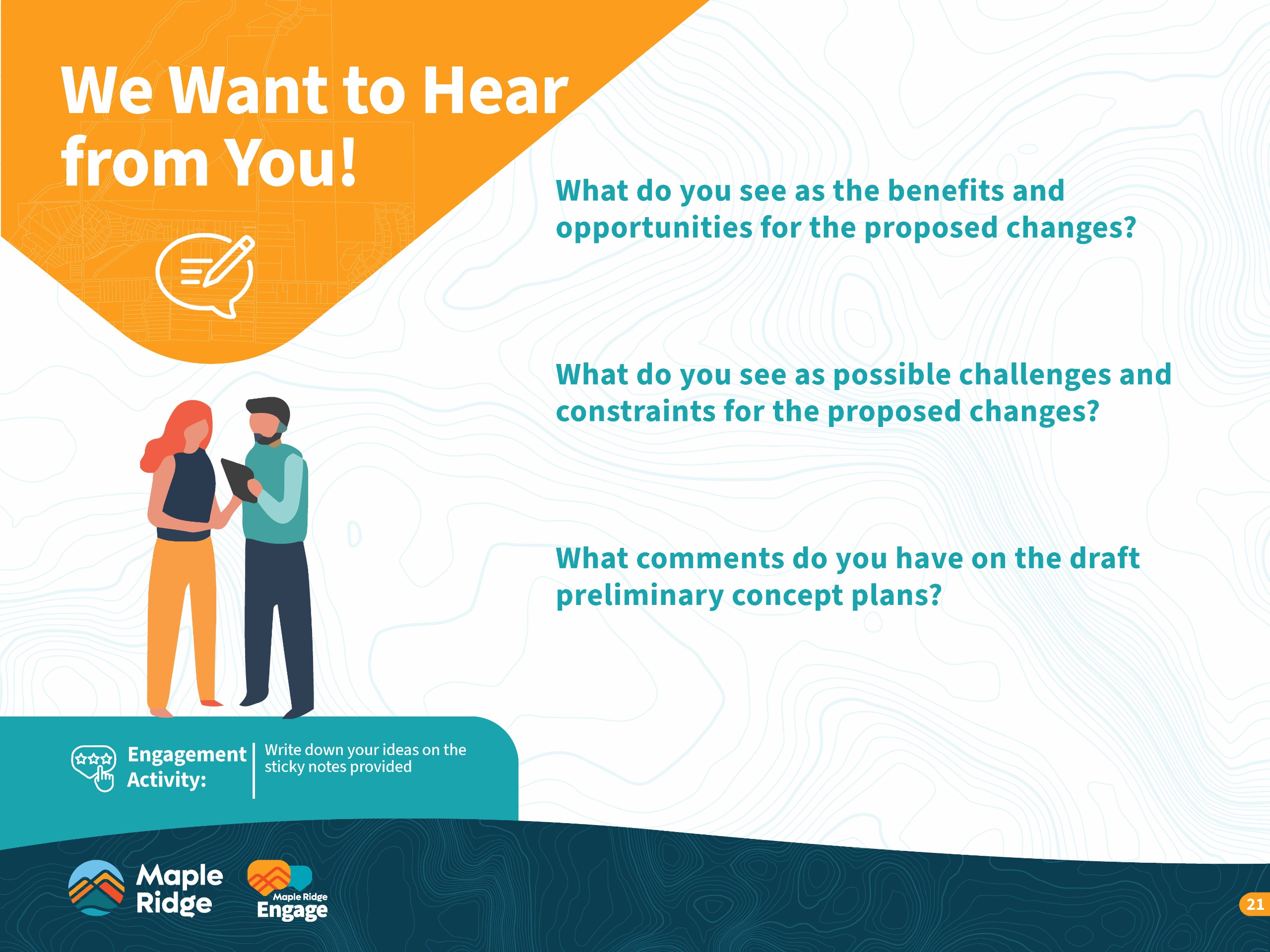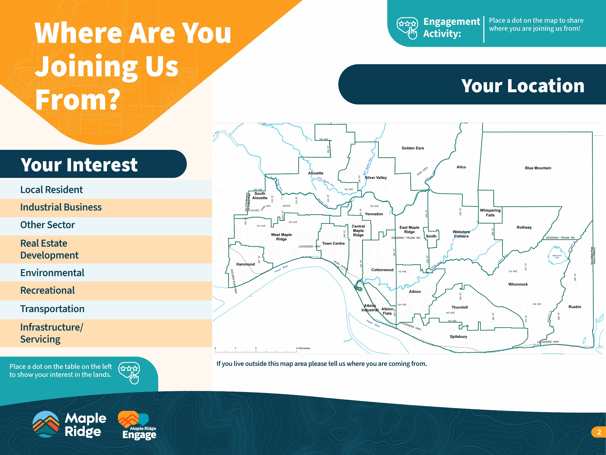 The engagement for phase 1 was at the "involve" level of the International Association for Public Participation's (IAP2) Spectrum of Public Participation and the City of Maple Ridge Engagement Framework.