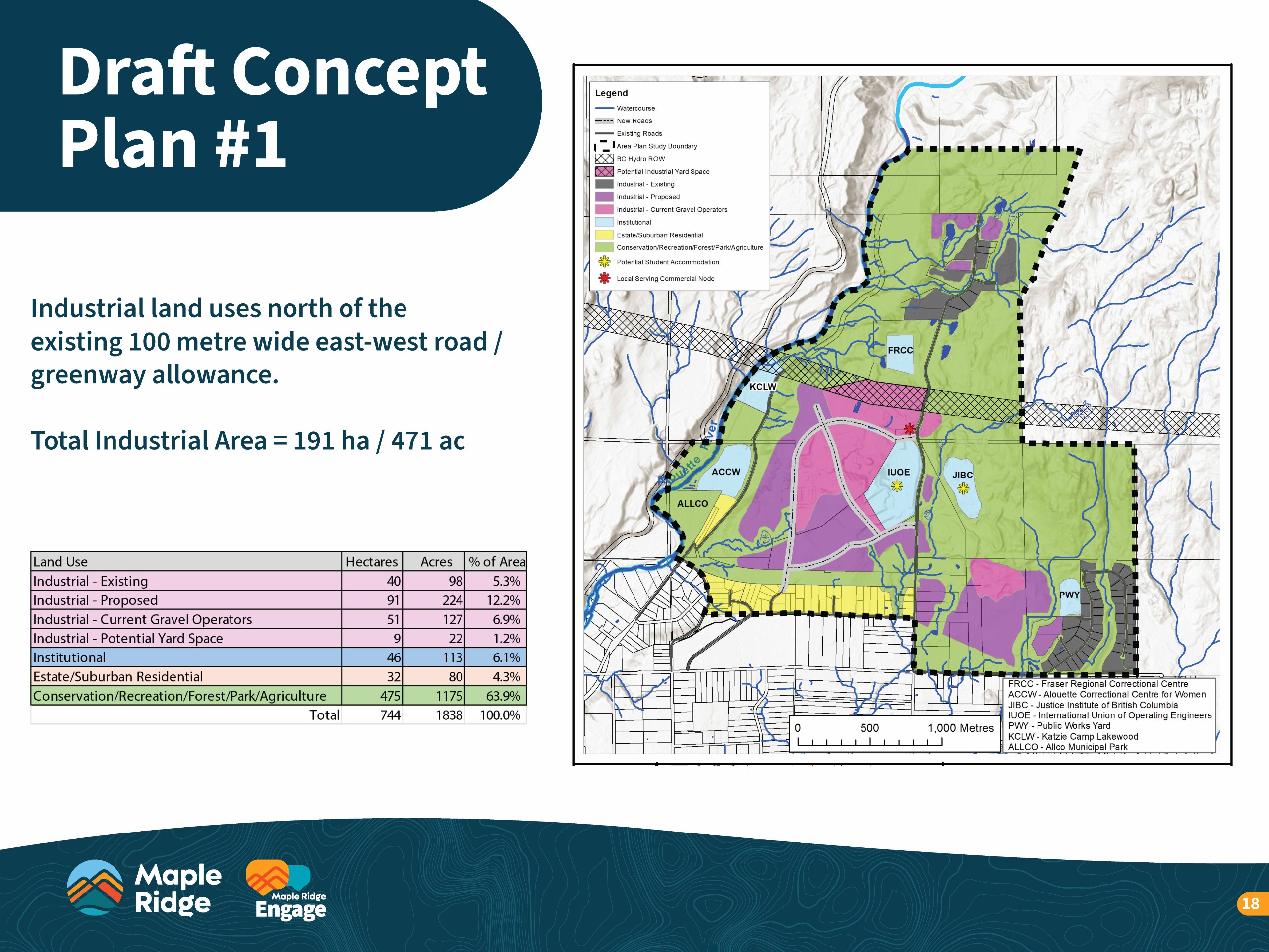 - Concept Plan 1 Keeps the existing 100-metre south greenway/road allowance as a buffer, with industrial development located to the north. This approach balances new industrial lands with environmental and recreational space.