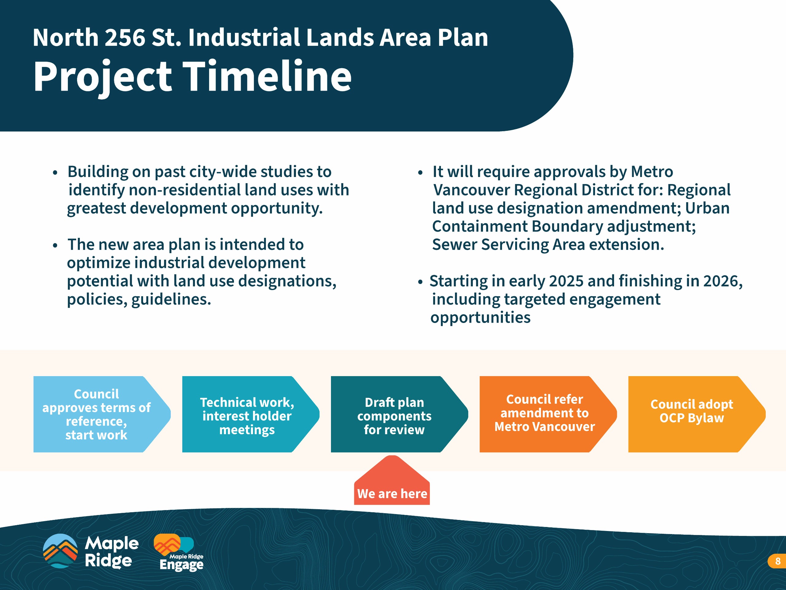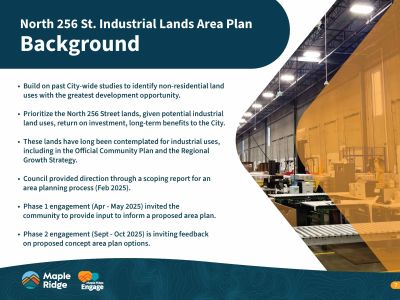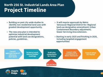 On Feb 25, 2025 Council directed staff to prepare an area plan for the North 256 Street lands, focusing on industrial use. Council's direction included approval of the Terms of Reference and scope of work. View the Staff Report to Council and the presentation (starting at 18:57) in the Document Library and Links sections on this page.