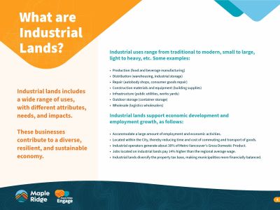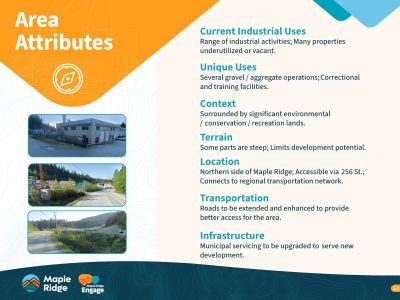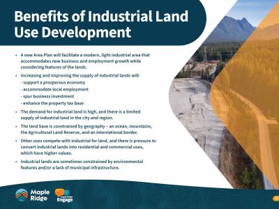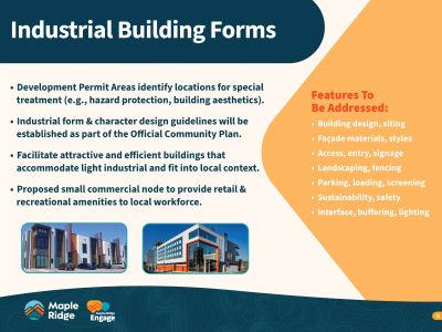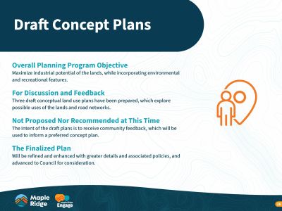 This initiative aims to transform underused land in northeast Maple Ridge into a modern light industrial hub, supporting local job creation, economic diversification, and long-term tax stability. Residents and interest holders are encouraged to review and provide feedback on three draft land use concepts, each offering varying levels of industrial expansion and environmental protection.