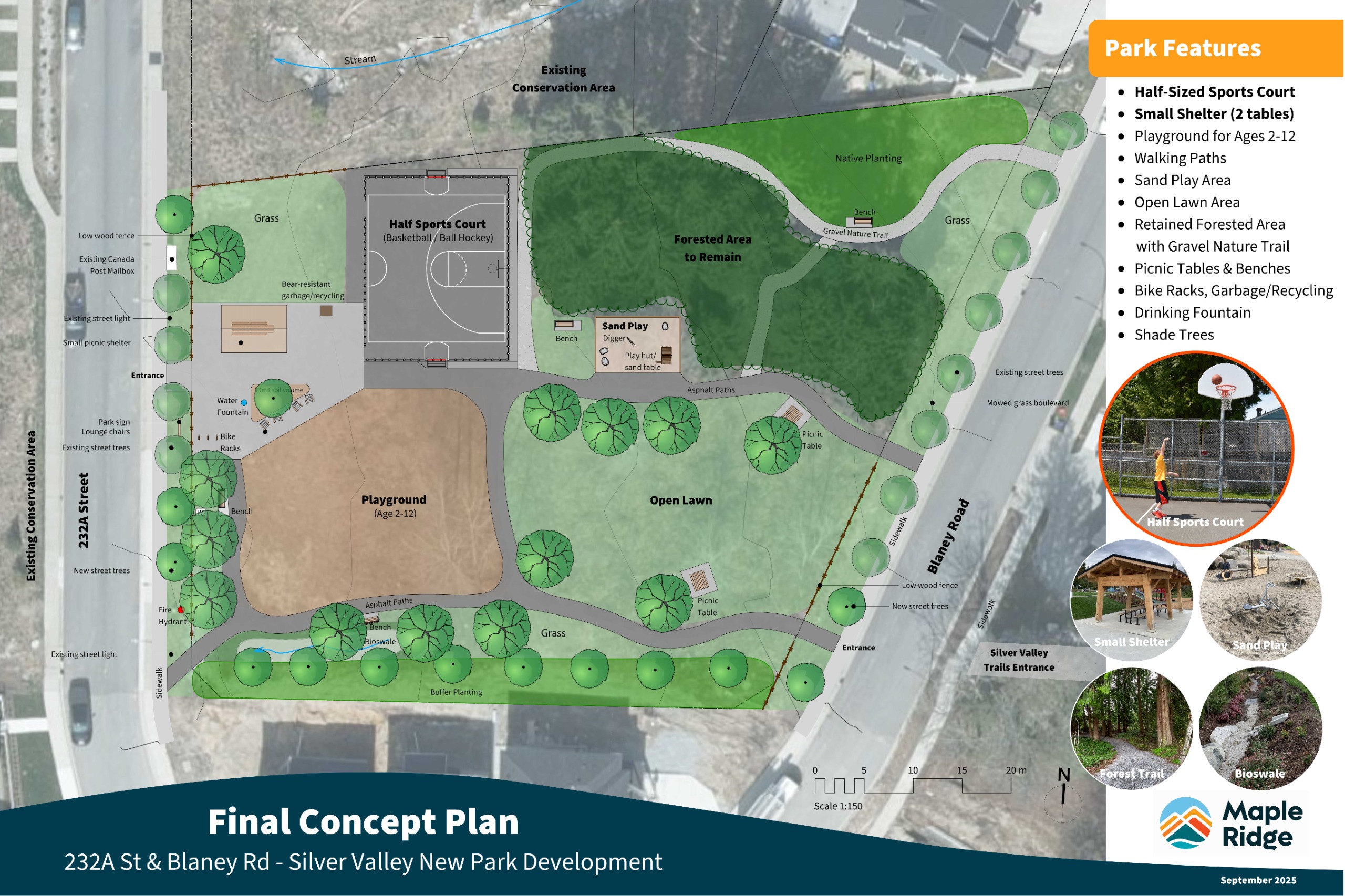 This new neighbourhood park is located between 232A Street and Blaney Road at 13650 232A St. The location was determined through the Silver Valley Area Plan which forms part of the City’s Official Community Plan. The design and development of this park is included in the City’s 2025 Capital Plan.