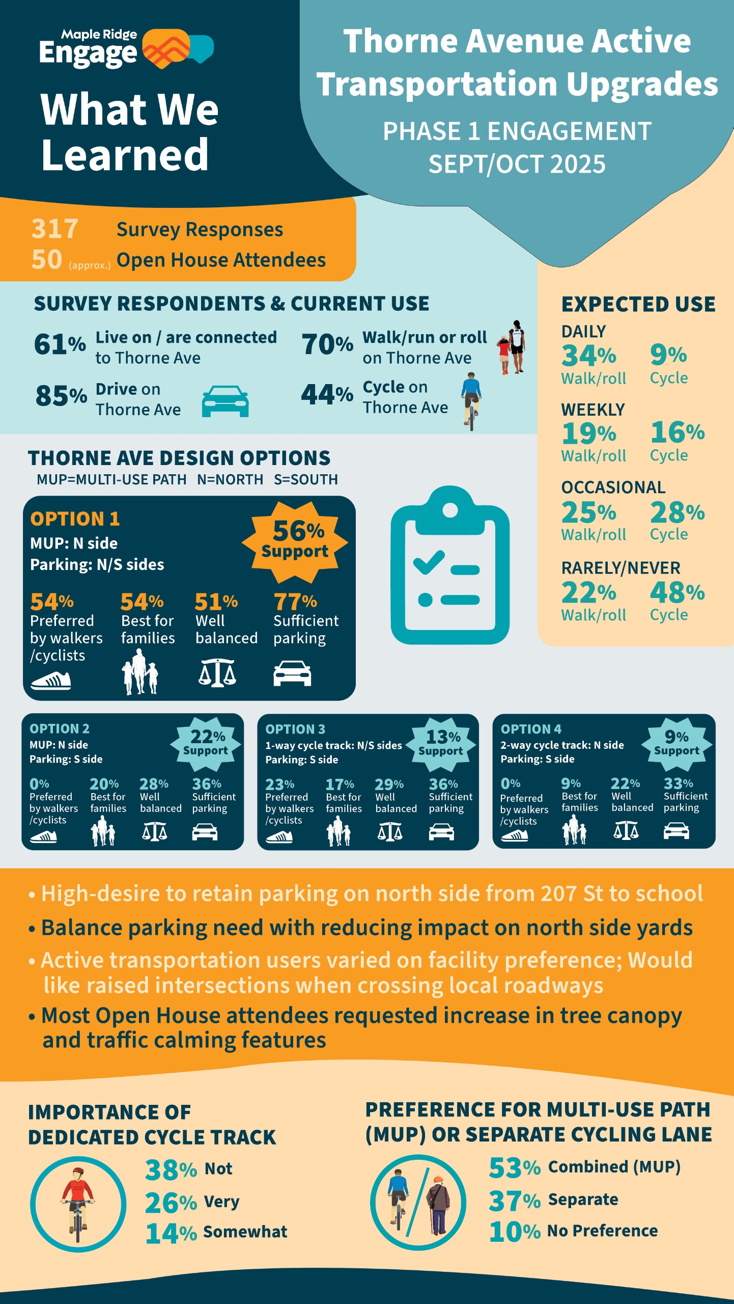 - Preferred Design Option: Participants were asked to review four design options, which included variations of multi-use paths, one-way and two-way cycling facilities, and changes to on-street parking. Overall, Option 1 featuring a multi-use path on the north side of Thorne Avenue with parking on both sides, received the strongest support: