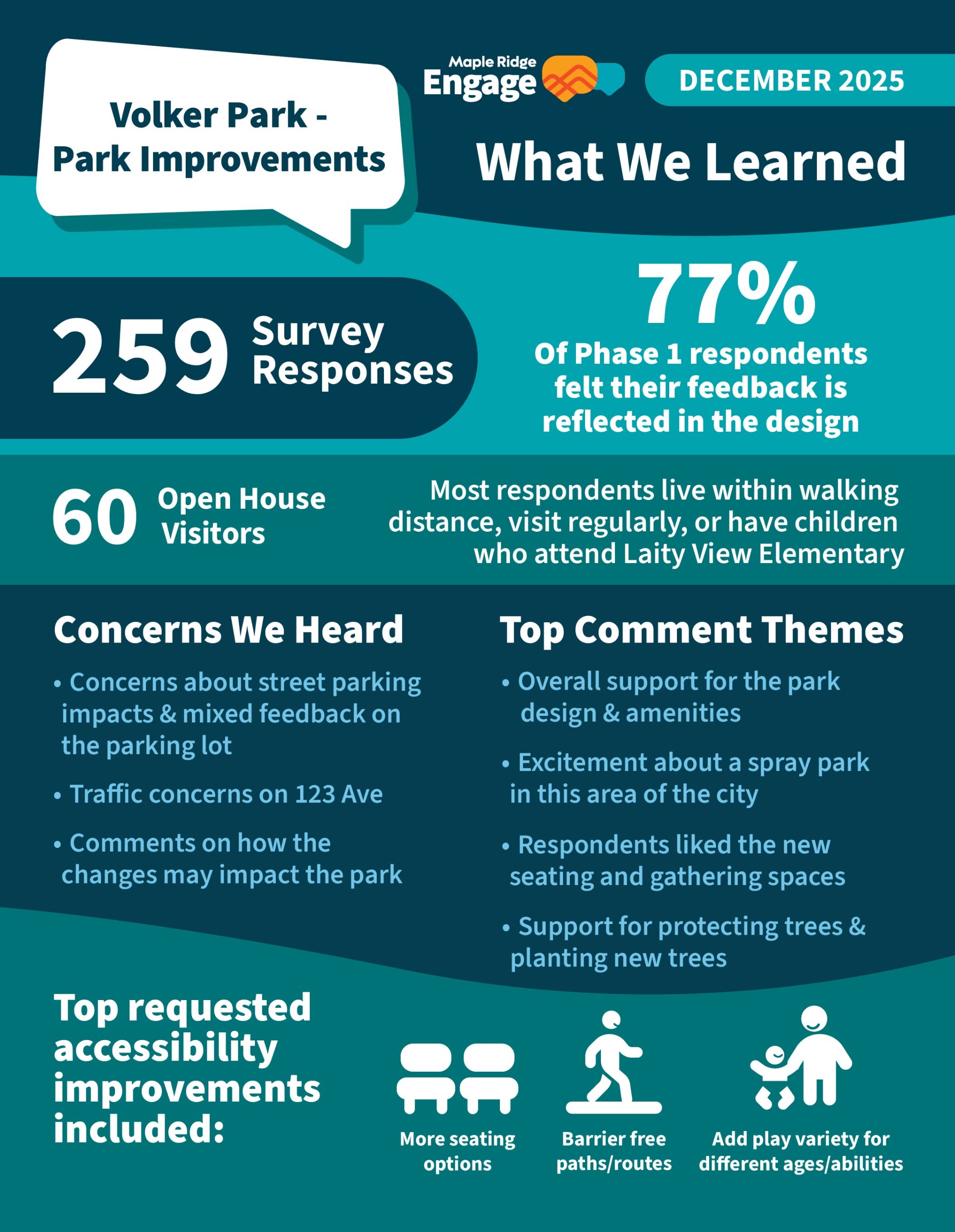 Engagement results indicated a strong interest in developing a spray park at Volker Park. The Volker Park site is large enough to accommodate a spray park and a spray park for west Maple Ridge was included in the City’s Capital Plan for 2025/2026.