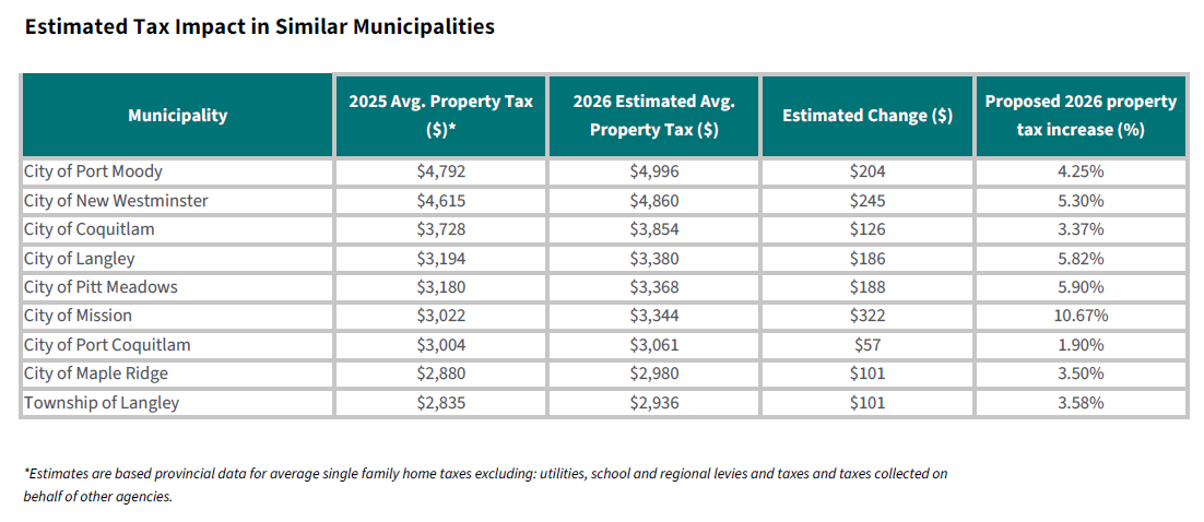 At a Special Council Meeting on February 17, Council directed staff to proceed with public engagement on the proposed 2026–2030 Financial Plan, including a proposed 2026 property tax increase of 3.5 per cent (approx. $101 for a property assessed at that average value for Maple Ridge of $1.04 million).