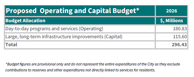 In 2026 the projected total budget for both day to day programs and services (Operating Budget) and large long-term investments (Capital Budget) is $296.43 million.